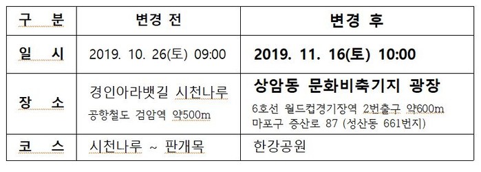 10월26일 인천 경인 아라뱃길 시천나루광장에서 개최하려던 ‘2019 제9회 환경페스티벌&환경마라톤대회’ 일정은 아래와 같이 오는 11월 16일 서울 상암동 문화비축기지 광장에서 개최한다.
