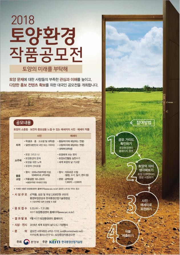 환경부 산하 한국환경산업기술원(원장 남광희)은 토양의 중요성을 널리 알리고 토양 보전에 대한 국민 관심을 높이기 위해 ‘2018 토양환경 작품공모전’을 개최한다.