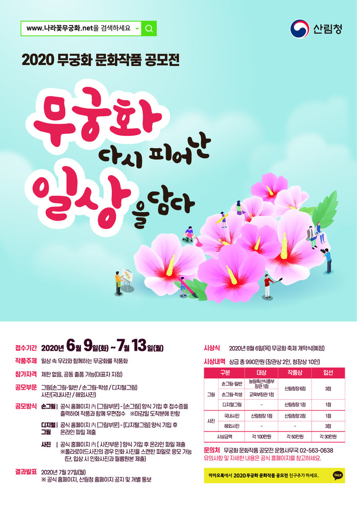 김주열 산림청 도시숲경관과장은 “이번 공모전을 통해 무더운 여름내 아름답게 피어나는 무궁화처럼, 코로나19를 극복하고 소중한 일상으로 돌아가길 희망한다”라며, “나라꽃 무궁화의 의미를 널리 알릴 수 있도록 많은 관심과 참여를 바란다”라고 말했다.