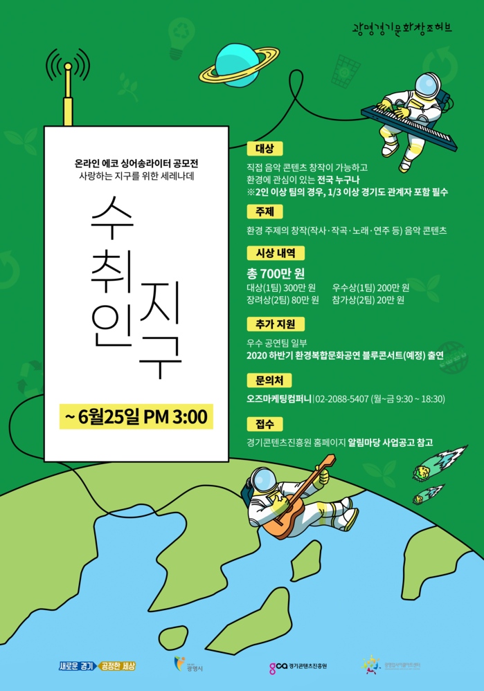[환경미디어= 김한결 기자] 경기콘텐츠진흥원이 운영 중인 광명경기문화창조허브에서 친환경 분야의 디자인·콘텐츠 분야 문화공감대를 형성하기 위한 “2020 사랑하는 지구를 위한 세레나데 - 수취인지구(온라인 에코 싱어송라이터 공모전)”를 진행한다.