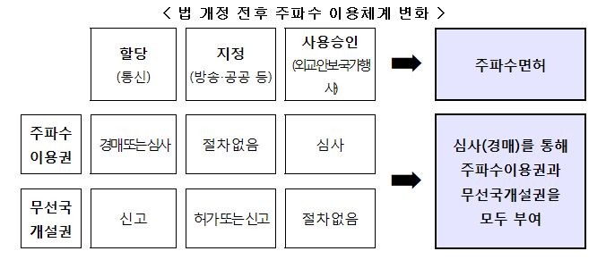 주파수를 이용하려는 자는 주파수 이용 권한과 더불어 그 주파수를 활용한 무선국의 개설 권한을 확보해야 하는데 현행 제도(주파수 할당‧사용승인‧지정)는 주파수 이용과 무선국 개설에 있어 서로 다른 규제체계를 적용하여 복잡하고 전파 수요자가 이해하기 어려운 문제가 있었다.