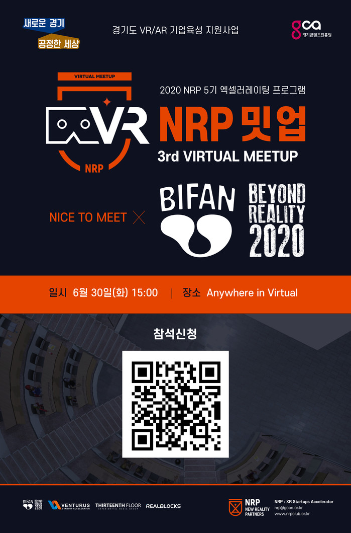 [환경미디어= 김한결 기자] 경기콘텐츠진흥원(원장 송경희)은 2020년 경기도 VR/AR 기업육성 지원사업의 일환으로 ‘2020 NRP VR-밋업 3회차’(이하 VR밋업)를 6월 30일 온라인 VR플랫폼을 통해 개최한다고 밝혔다.