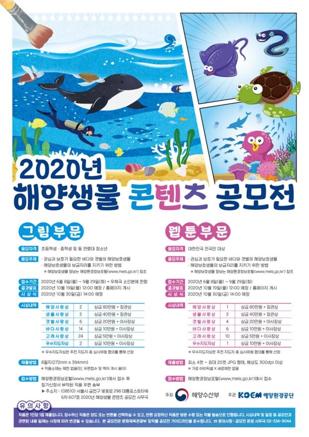 [환경미디어= 김한결 기자] 해양수산부는 해양환경공단과 함께 해양생물을 보호하고 해양생태계 보전에 대한 국민의 관심을 높이기 위해 ‘2020년 해양생물 콘텐츠 공모전’을 개최한다고 밝혔다.