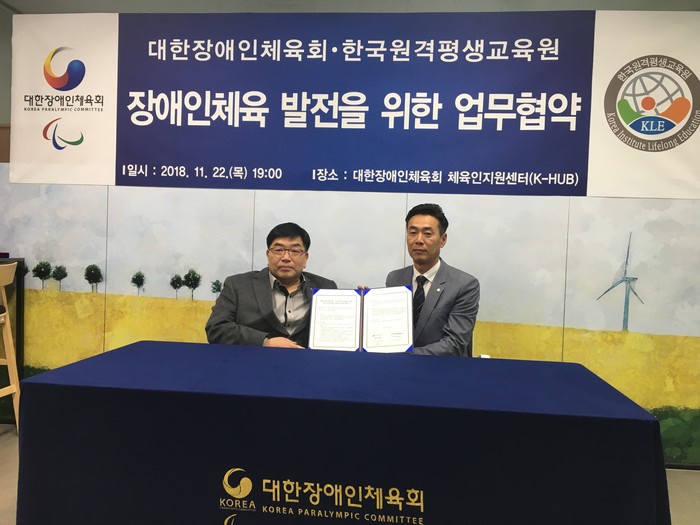 대한장애인체육회(회장 이명호)와 한국원격평생교육원(이사장 권주안)은 22일 대한장애인체육회 체육인지원센터에서 장애인체육인들의 온라인교육을 통한 학위(체육학) 취득과정 장학금 지원과 장애인체육 발전을 위한 상호협력을 위한 업무협약(MOU)을 체결했다.