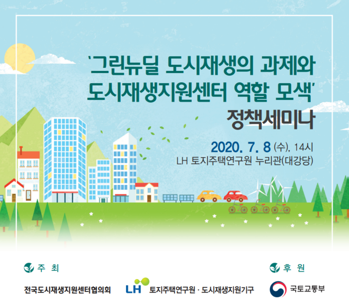이번 정책세미나는 포스트 코로나 시대를 대비해 환경과 사람 중심의 ‘그린뉴딜 도시재생 실현’을 위한 추진과제를 발굴하고 도시재생지원센터의 역할을 모색하기 위해 전국도시재생지원센터협의회와 LH토지주택연구원 및 도시재생지원기구가 공동개최하고 국토교통부가 후원한다.
