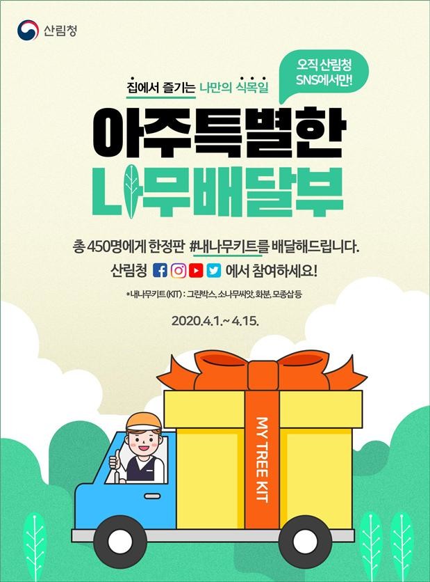 [환경미디어= 김한결 기자] 산림청은 제75회 식목일을 앞두고 2020 내나무 갖기 캠페인의 일환으로 ‘아주 특별한 나무 배달부’ SNS 이벤트를 추진한다고 밝혔다.
