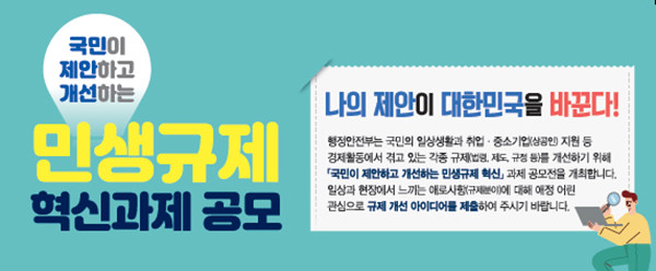 [환경미디어= 김명화 기자] 행정안전부는 오늘(19일)부터 ‘국민이 제안하고 개선하는 민생규제 혁신’ 과제 공모전을 개최한다.
