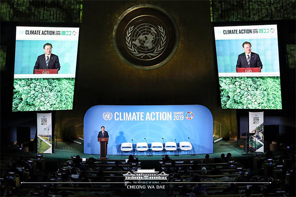 | ▲ 문재인 대통령이 23일 오후(현지시간) 美 뉴욕 유엔총회 회의장에서 ‘기후행동 정상회의’ 연설을 하고 있다.<청와대 제공> |