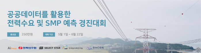[환경미디어= 김한결 기자] 경기창조경제혁신센터 케이챌린지랩(K-Challenge Lab) 1기 기업이자 데이터 사이언스 플랫폼 기업 데이콘(DACON)은 오는 5월 1일 부터 '공공데이터를 활용한 전력수요 & SMP 예측 경진대회'를 진행한다고 밝혔다.
