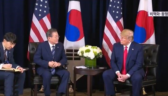 유엔총회 참석차 미국 뉴욕을 방문 중인 문 대통령은 이날 인터콘티넨털 바클레이 호텔에서 도널드 트럼프 미국 대통령과 1시간5분 동안 정상회담을 갖고 북미 실무협상에서 조기에 실질적 성과를 도출하기 위한 방안에 대해 논의한 뒤 이같이 의견을 모았다고 고민정 청와대 대변인이 브리핑에서 전했다.