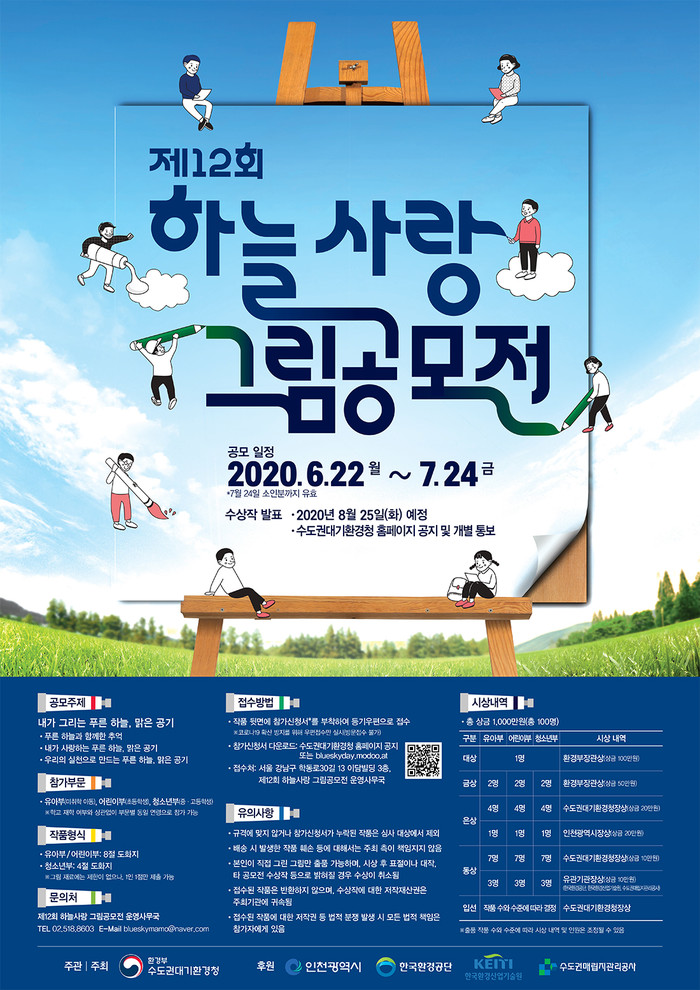 접수방법은 수도권대기환경청 누리집이나, 제12회 하늘사랑 그림 공모전 운영 누리집에서 참가신청서를 내려받아 작성한 후, 작품 뒷면에 부착해 운영사무국으로 등기우편 접수하면 된다.