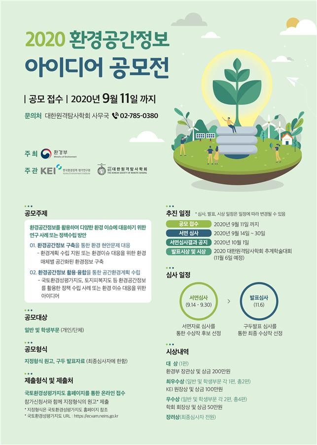 [환경미디어= 김한결 기자] 환경부(장관 조명래)는 한국환경정책·평가연구원, (사)대한원격탐사학회와 공동으로 다양한 분야에서 환경공간정보의 활용도를 높이기 위해 ‘2020 환경공간정보 아이디어 공모전’을 개최한다고 밝혔다.