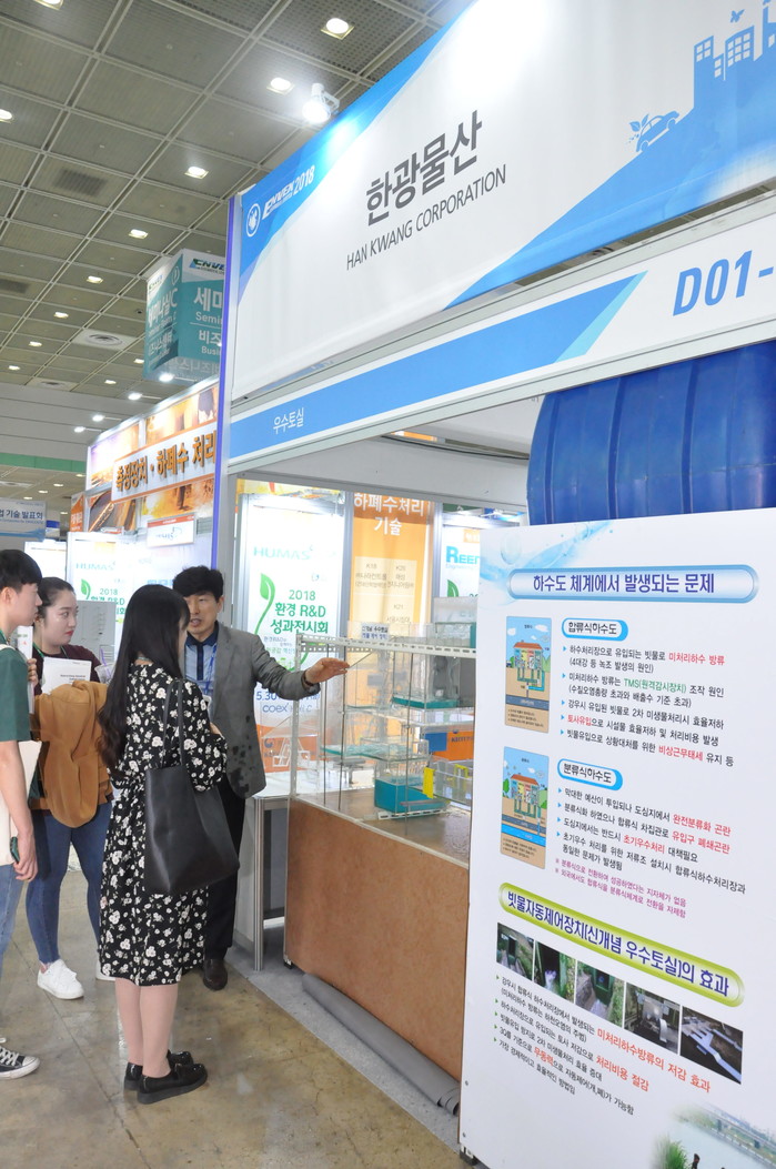 한광물산은 우수시 기존의 합류식하수도와 분류식하수도 시스템으로도 해결하지 못한 미처리하수 방류 문제를 개선할 수 있는 '빗물자동제어장치'를 선보였다.