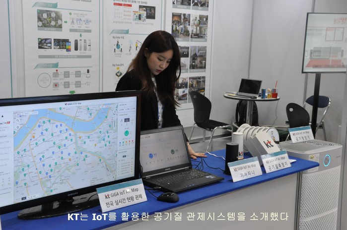 실내외 미세먼지 상태를 관리 및 분석하여 지역/계절/시간별 미세먼지 발생원 파악 및 예보서비스를 제공하는 기술인 'KT IoT Air Map'을 선보였다.
