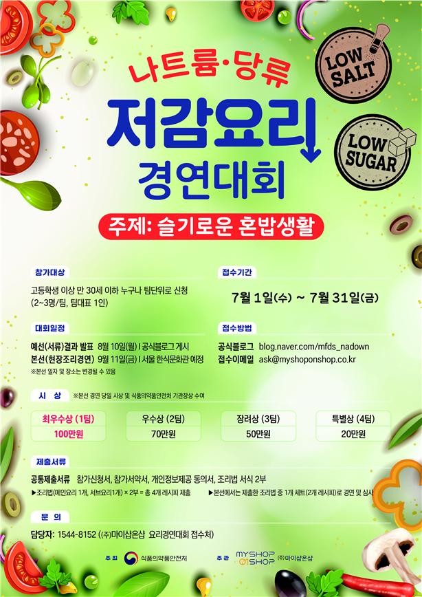 경연 주제는 ‘한 끼 식사 나트륨‧당류 저감 및 영양을 고려한 혼밥 레시피’이며, 만 15세 이상 만 30세 이하의 팀 단위로 7월 한 달간 온라인을 통해 신청할 수 있다.