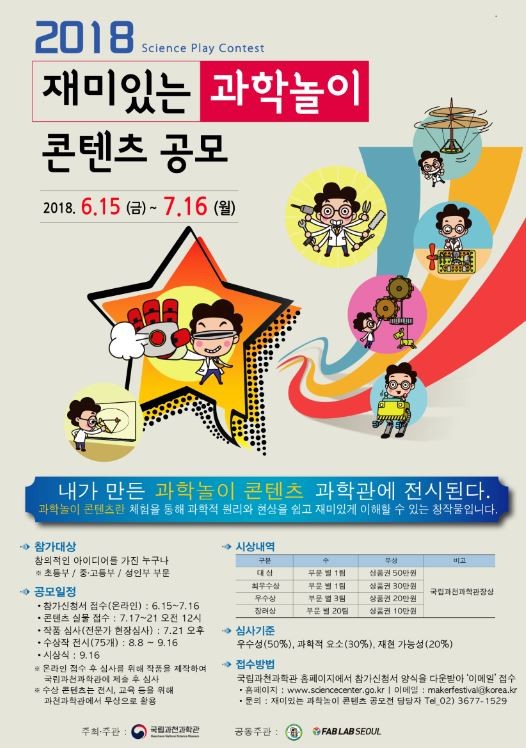 국립과천과학관(관장 배재웅)에서는 ‘재미있는 과학놀이 콘텐츠 공모전’ 참가 신청서를 6월 15일부터 7월 16일까지 접수한다.