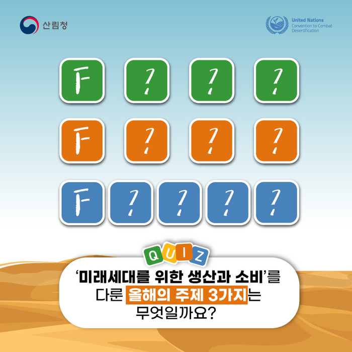 올해는 세계적 행사가 한국에서 개최되며 사막화 및 가뭄의 날 주제인 미래세대를 위한 생산과 소비 일명 3F(Food,Feed,Fiber)를 통해 우리 실생활 속 녹색 소비 방안에 대해 적극적인 참여를 요청하고 있다.
