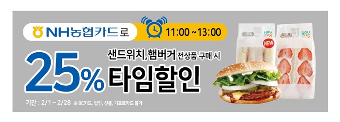 GS리테일이 운영하는 편의점 업계 매출 1위 GS25는 11시부터 13시까지 NH농협카드로 GS25가 판매하고 있는 샌드위치,햄버거를 구매하면 25% 할인 혜택을 제공하는 타임 할인 이벤트를 진행한다.