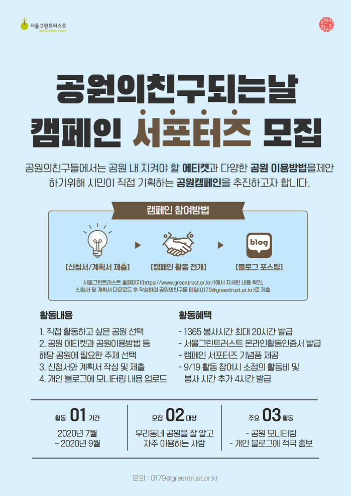 이번 캠페인은 9월 19일 진행되는 ‘공원의 친구되는 날 시민편’ 참여를 끝으로 활동이 종료되며 모든 서포터즈에게는 서울그린트러스트 온라인 활동 인증서, 1365 봉사활동 최대 20시간, 캠페인 서포터즈 한정 기념품이 제공된다. 같은 날 서울숲공원에서 진행되는 공원의 친구되는 날 시민편 캠페인 활동에 참여하는 서포터즈에게는 소정의 활동비와 함께 1365 봉사 시간이 4시간 추가 발급된다.