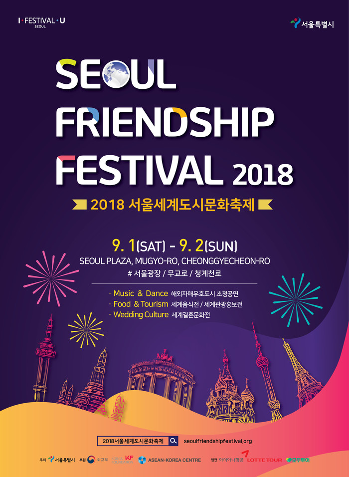 서울시가 9월 첫 주말인 1일(토)과 2일(일) 서울시 자매우호도시와 세계 각 국의 문화를 한자리에서 즐길 수 있는 서울시 대표 글로벌 축제 「2018 서울 세계도시 문화축제(Seoul Friendship Festival 2018)」를 서울광장, 무교동 거리, 청계천로 등 도심에서 연다.