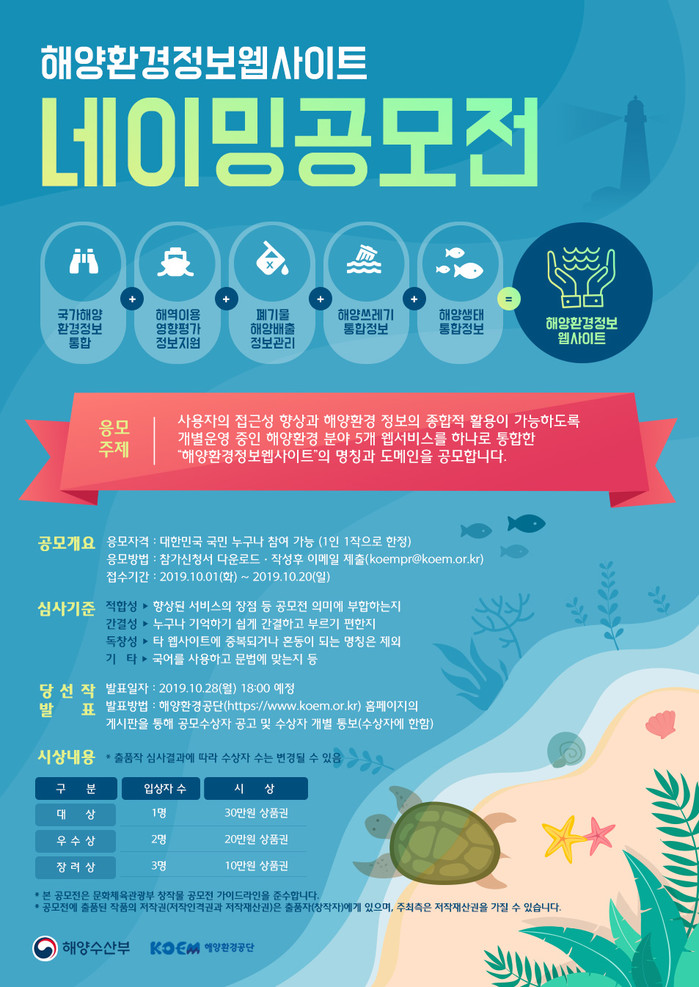 [환경미디어= 강유진 기자] 해양환경공단(KOEM, 이사장 박승기)은 10월 1일부터 20일까지 ‘해양환경정보 웹사이트 네이밍 공모전’을 개최한다.