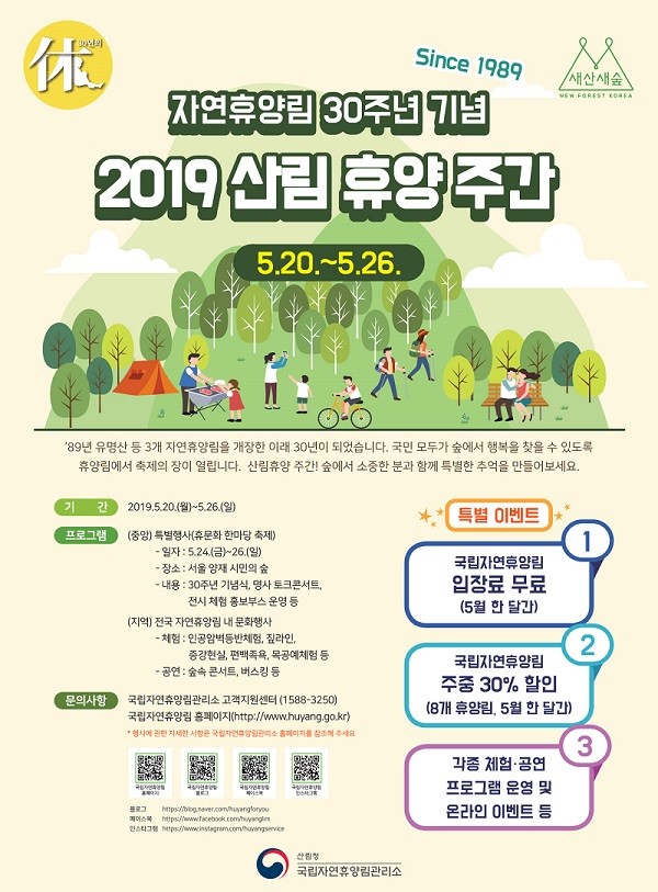 특히, 5월 한 달간 국립자연휴양림 무료 입장, 8개 국립자연휴양림 주중 객실 사용료 30% 할인 등 다양한 이벤트가 진행된다.