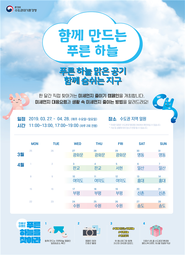 환경부 소속 수도권대기환경청(청장 김동구)은 3월 27일부터 4월 28일까지 수도권 지역 사무단지와 번화가 일대에서 ‘시민들과 함께하는 미세먼지 줄이기 운동(캠페인)’을 펼친다.