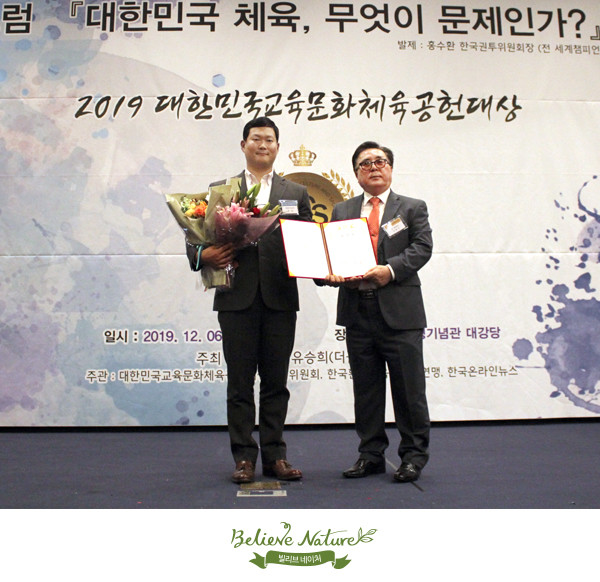 빌리브네이처(대표이사 주영)가 지난 6일 국회 헌정기념관에서 열린 ‘2019 대한민국 교육문화 체육공헌 대상’ 시상식에서 환경분야 유기농 부문 국회 상임위원장상을 수상했다.