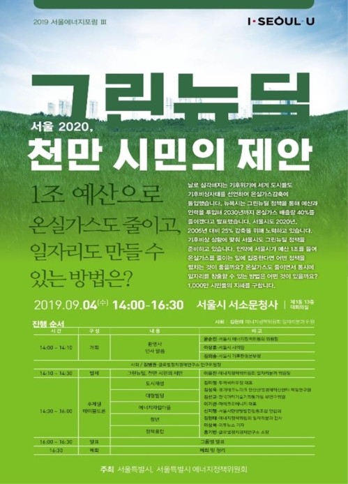 발제는 에너지정책위원회 일자리분과 이유진 위원장이 맡는다. 뉴욕시의 '그린뉴딜' 등 국제적인 기후변화 대응 정책, 서울시의 온실가스 감축 계획 등을 소개한다.