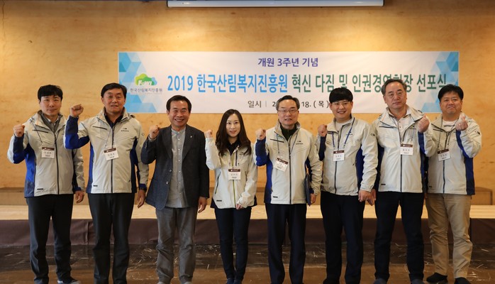 산림청 한국산림복지진흥원(원장 윤영균)은 18일 충북 충주시 노은면 깊은산속옹달샘에서 본원 임직원 80여 명이 참석한 가운데 개원 3주년 기념 혁신다짐대회 및 인권경영헌장 선포식을 가졌다고 밝혔다.