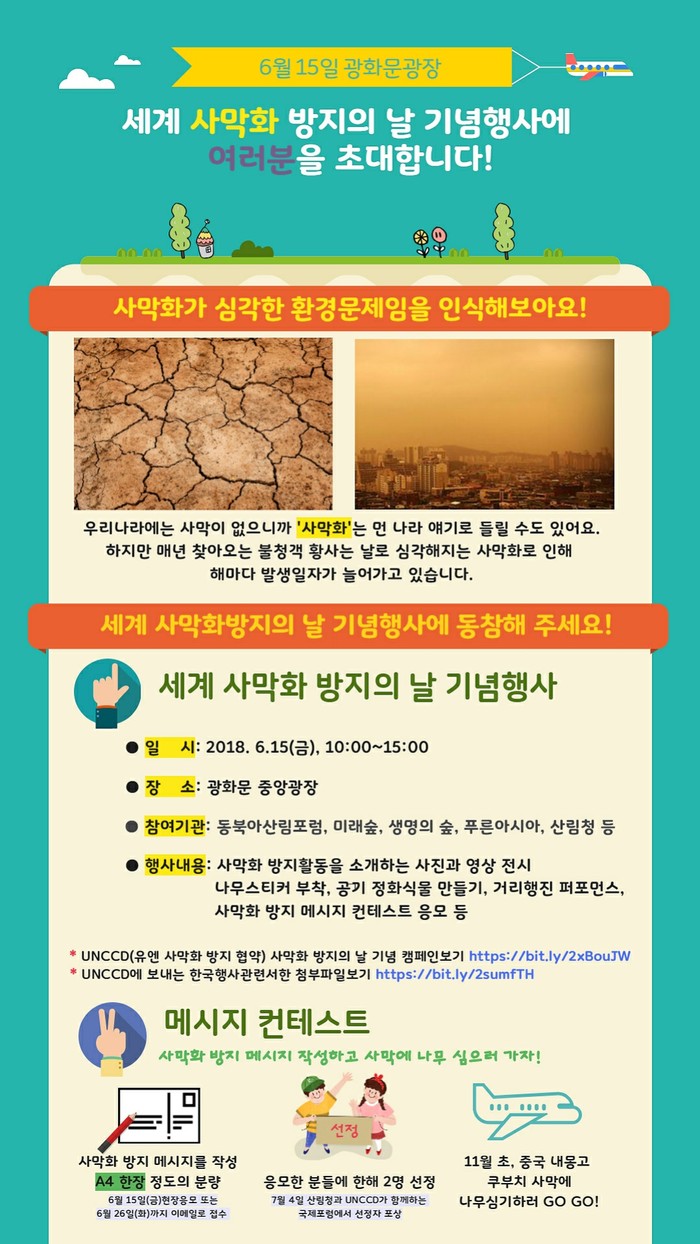 특히 ‘메시지 콘테스트’에서는 사막화 방지 메시지를 작성해 접수한 시민을 대상으로 2명을 선정하고 11월 초 중국 내몽고 쿠부치 사막에서 나무를 심는 기회를 제공한다.