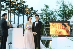 11살의 나이차가 무색할 만큼 잘 어울리는 두 사람의 결혼을 축복하기위해 봉사활동을 함께하는 ‘따사모’ 회원인 김정은, 소유진, 김규리는 물론이고 장동건, 이휘재, 김민종 등 연예계 지인들도 다수 참석하여 두 사람의 웨딩데이를 빛냈다. 화려한 웨딩마치 후 지인들과의 피로연에서 6월의 신부 최현주가 선택한 이브닝드레스는 전체적으로 미니멀한 드레스라인을 기본으로 허리라인을 보다 슬림하게 연출해줄 컷아웃 디자인이 특징인 ‘리비니(RIVINI)’ 드레스다. 리비니만의 세련된 스타일이 최현주와 잘 어우러져 감각적인 브라이덜룩을 완성했다.