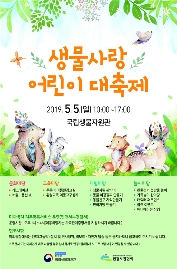 환경부 소속 국립생물자원관은 어린이날을 맞아 어린이와 가족들을 위한 ‘생물사랑 어린이 대축제’를 5월 5일 하루 동안 인천시 서구 국립생물자원관 전시교육동과 야외마당에서 개최한다.