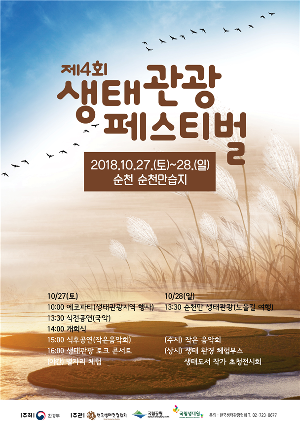환경부(장관 김은경)는 생태관광을 널리 알리기 위해 10월 27일부터 28일까지 전남 순천시 순천만습지에서 ‘제4회 생태관광 페스티벌’을 개최한다.