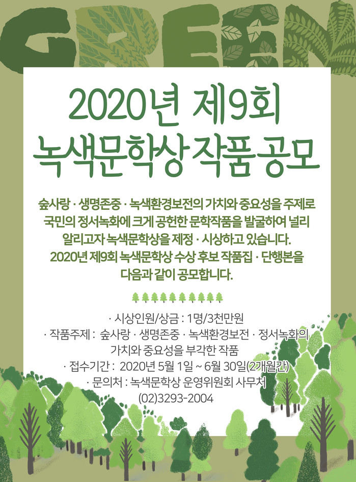 [환경미디어= 김한결 기자] 산림청은 5월 1일부터 6월 30일까지 2020년 제9회 녹색문학상 작품을 공모한다고 27일 밝혔다.
