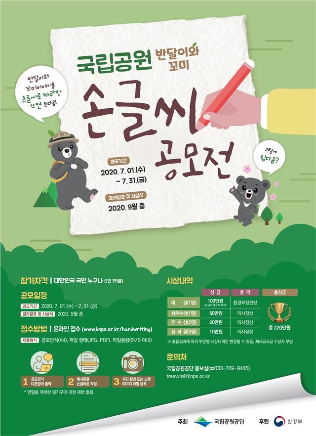 권욱영 국립공원공단 홍보실장은 “이번 반달이와 꼬미 손 글씨 공모전에 독창적이고 아름다운 글씨체를 가진 사람들의 적극적인 참여를 바란다”라고 말했다.