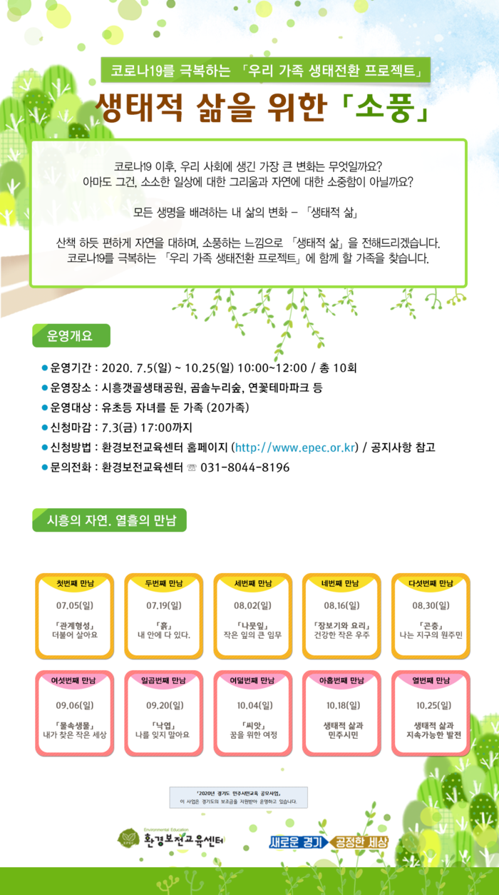 오는 7월 5일 개강 예정이며, 프로그램 신청은 환경보전교육센터 홈페이지를 통해서 가능하다. 유초등 자녀를 둔 시흥시민 누구에게나 열려있다.