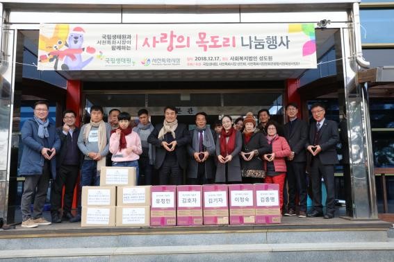 이번 행사는 국립생태원, 서천특화시장 상인회, 서천특화시장문화관광형육성사업단(중소기업벤처부) 임·직원 20여명이 서천지역의 장애인 복지시설인 ‘성도원’에 방문하여 목도리와 담요 100개, 쌀 100kg을 전달했다.