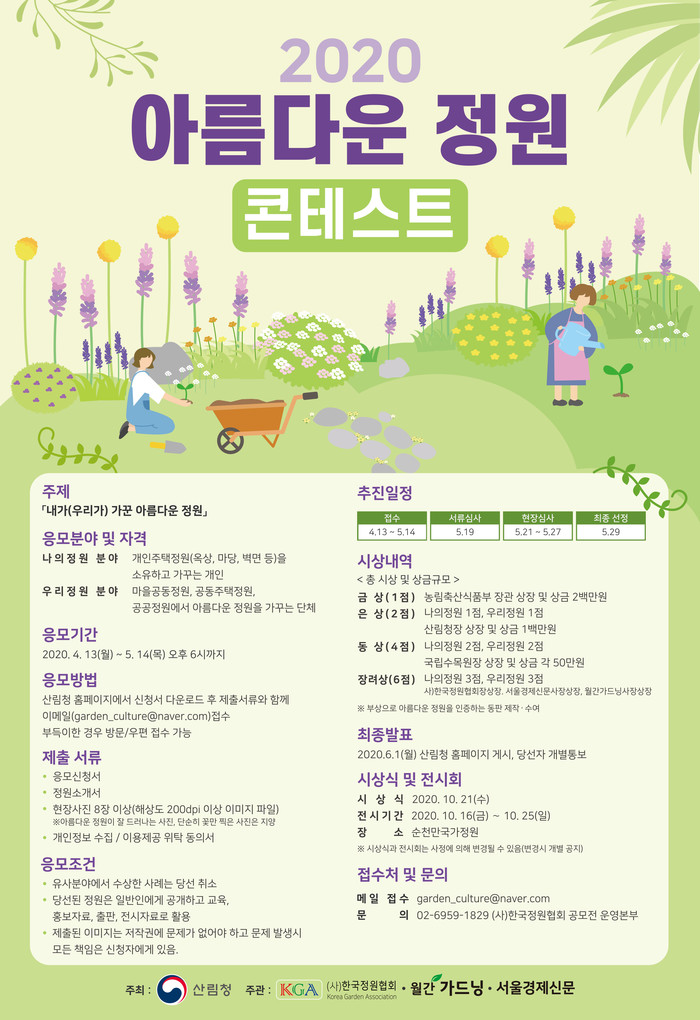 산림청이 주최하고 (사)한국정원협회ㆍ월간가드닝ㆍ서울경제신문이 공동주관하는 이번 공모전은 "내가(우리가) 가꾼 아름다운 정원"이란 주제로 나의 정원과 우리 정원 2개 분야로 나눠 개최된다.