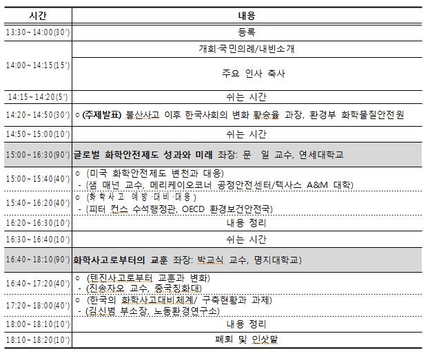 1부에서는 화학사고 대응 전문훈련기관으로 유명한 미국 텍사스의 에이앤엠(A&M) 대학 샘 매넌(M. Sam Mannan) 교수가 ‘미국의 화학안전 제도 변화와 대응’에 대해 발표한다.