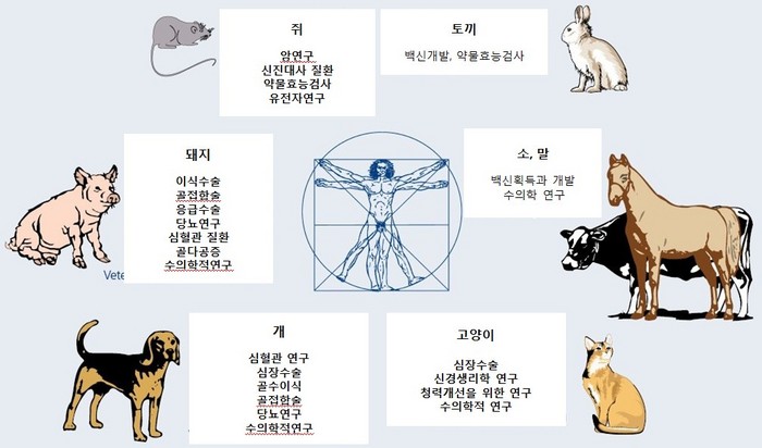 하지만 우리가 일반적으로 생각하는 동물실험은 새로운 제품이나 치료법의 효능과 안전성을 확인하기 위한 것으로, 비단 의약품뿐만 아니라 농약이나 화장품, 식품 등이 인체에 미치는 영향을 예측하는 데에도 활용된다.