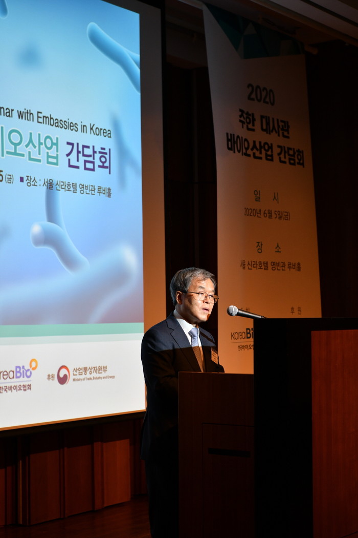 이어서 산업부 대표로 간담회에 참석한 김재준 과장은 코로나19 사태에 대해 “국내 뿐만 아니라 세계 바이오산업의 기대를 높이면서 동시에 바이오산업의 한계를 확인하게 된 기회”라고 평가했다. 이어서 그는 “언제 치료제와 백신을 얻을 수 있을지 아무도 장담하기 어려운 상황에서 각 국가와 기업을 넘나드는 초월적 공조가 이뤄지지 않으면 이 사태를 해결할 수 없을 것”이라 밝혔다. 산업통상자원부는 지난 4월부터 드라이브스루, 생활치료센터 등 국내 방역정책을 국제표준 가이드라인으로 제안하며 K-방역과 K-바이오의 진출을 지원하겠다 밝힌 바 있다.