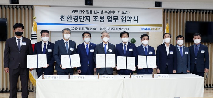 한국수자원공사는 경기도, 광명시, 시흥시, 경기도시공사와 광역관로 원수를 활용한 친환경 수열에너지 도입 업무협약을 6월 5일 오후 경기도청에서 체결했다.