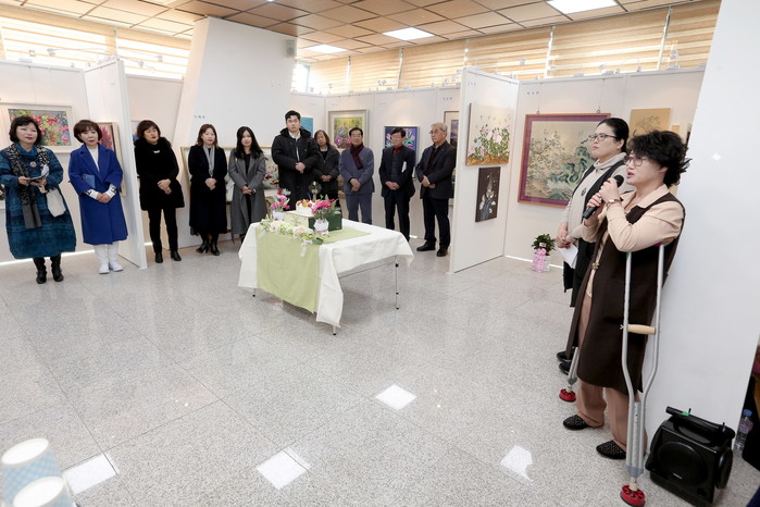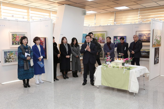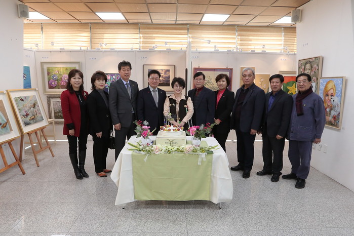올리브그린아트 전시회 개막식이 16일 오후 양구 비봉전망대 갤러리에서 조인묵 약구군수, 이상건 의장과 박미량 올리브그린아트 회장 및 회원들이 참석한 가운데 열렸다. 전시회는 오는 21일까지 진행된다.