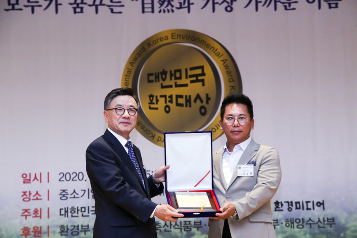 ▲ 임철환 애니우드 대표(오른쪽)가 환경신소재 부문 환경대상을 수상했다. |