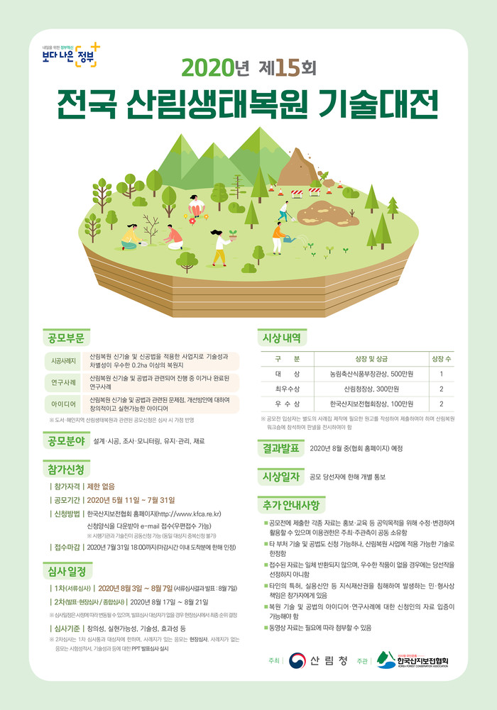 심사는 전문가로 구성된 심사단을 통해 창의성, 실현 가능성, 기술성, 효과성 등을 기준으로 입상작 5점을 선정하고, 결과는 8월 중 한국산지보전협회 누리집에 공지할 계획이다.