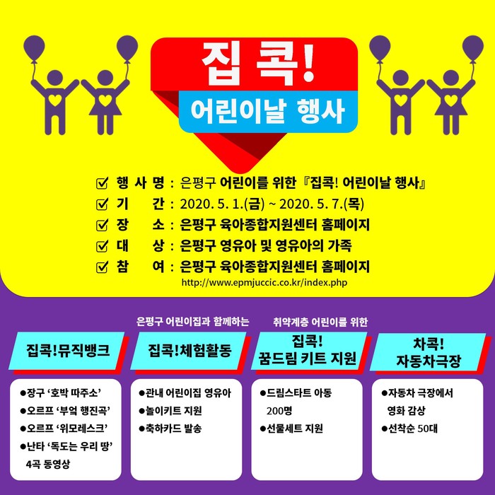 이번 온라인 행사는 집콕! 뮤직뱅크, 은평구 어린이집과 함께하는 집콕! 체험활동, 취약계층 어린이를 위한 집콕! 꿈드림 키트 지원, 차콕! 자동차 극장으로 진행되며,