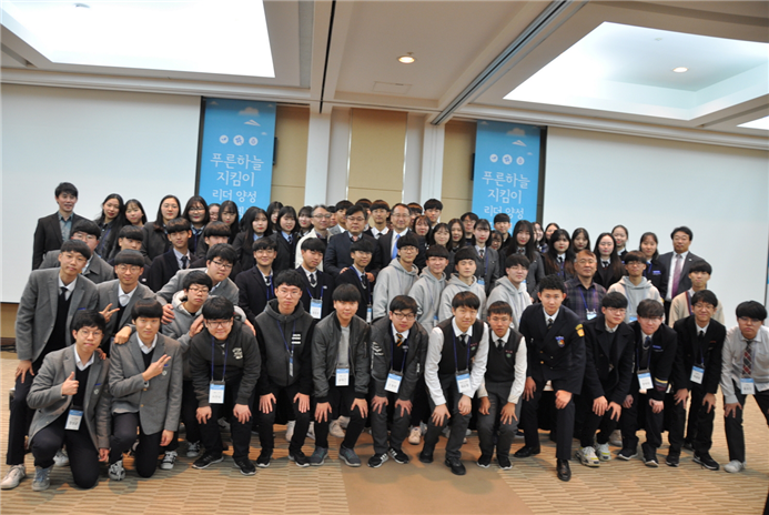| ▲ 환경부 소속 수도권대기환경청(청장 김동구)은 오늘 11월 6일(화) 서울 강남구 코엑스에서 미세먼지 줄이기에 앞장선 청소년들의 우수 활동 사례를 공유하는 ‘푸른하늘 지킴이 리더 양성 프로젝트 발표대회’를 개최했다. 행사에 참여한 고등학생들이 기념사진을 촬영하고 있다. <사진=수도권대기환경청 제공> |