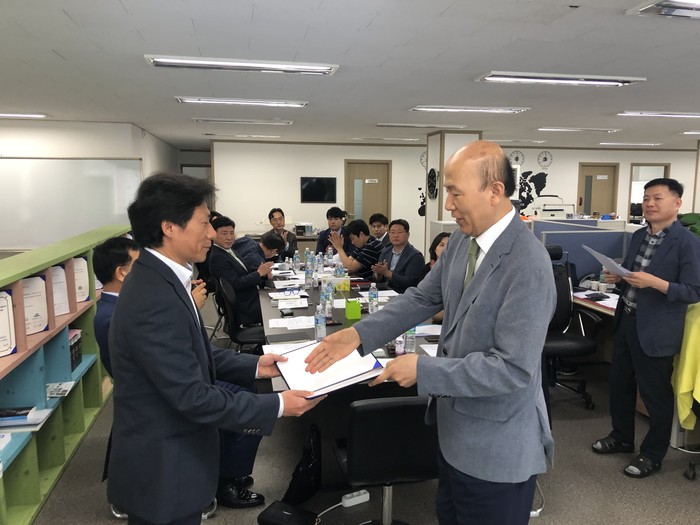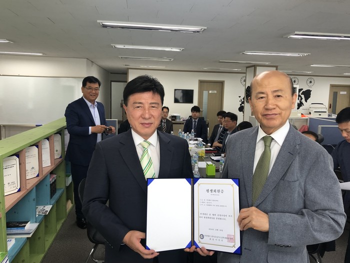 | ▲ 이만의 회장이 극동ECT(주) 정충의 회장에게 평생회원증을 수여했다. |