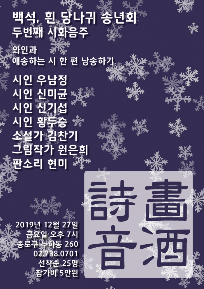 종로구 누하동 260번지에 있는 '백석, 흰 당나귀'에서 12월 27일 오후 7시에 시와 음악과 그림이 있는 특별한 송년회를 개최한다.